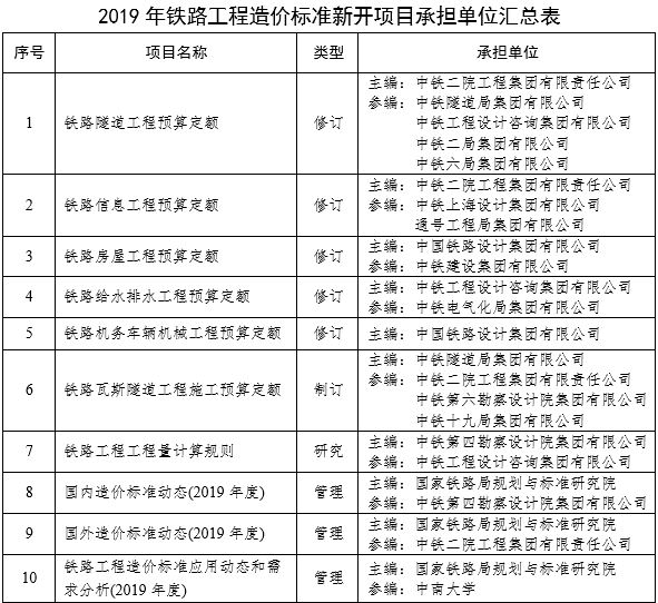 国家铁路局规划与标准研究院2019年铁路工程造价标准新开项目承担单位选择方案公示