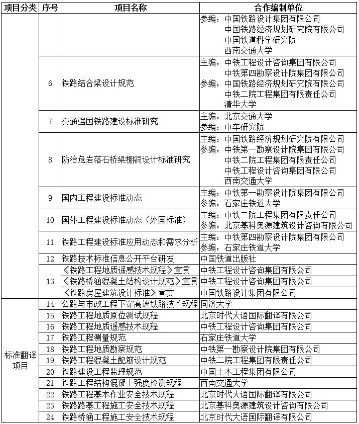 国家铁路局规划与标准研究院2019年铁路工程建设标准项目合作编制单位选择方案公示