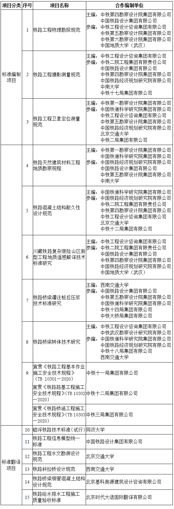 国家铁路局规划与标准研究院2020年铁路工程建设标准项目合作编制单位选择方案公示