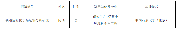 根据事业单位公开招聘工作有关规定,按照《国家铁路局市场监测评价中心2023年度公开招聘应届毕业生公告》要求,现将我单位2023年度公开招聘应届毕业生“铁路危险化学品运输分析研究”岗位拟聘用事业单位工作人员予以公示,“铁路运输市场分析研究”岗位因无人满足进入体检考察环节要求,取消该岗位招聘计划。公示期间,如有问题,请向我单位反映,或直接通过中央和国家机关所属事业单位公开招聘服务平台反映。